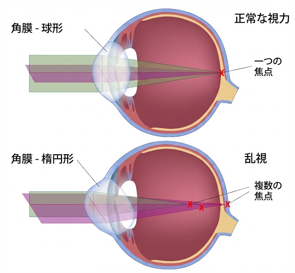 乱視とは、角膜(黒目)のカーブがラグビーボールのように歪んでいるために、光の焦点が一点に合わない状態を指します。白内障手術では、この乱視をいかに正確に測定し、適切なレンズで矯正するかが重要です。